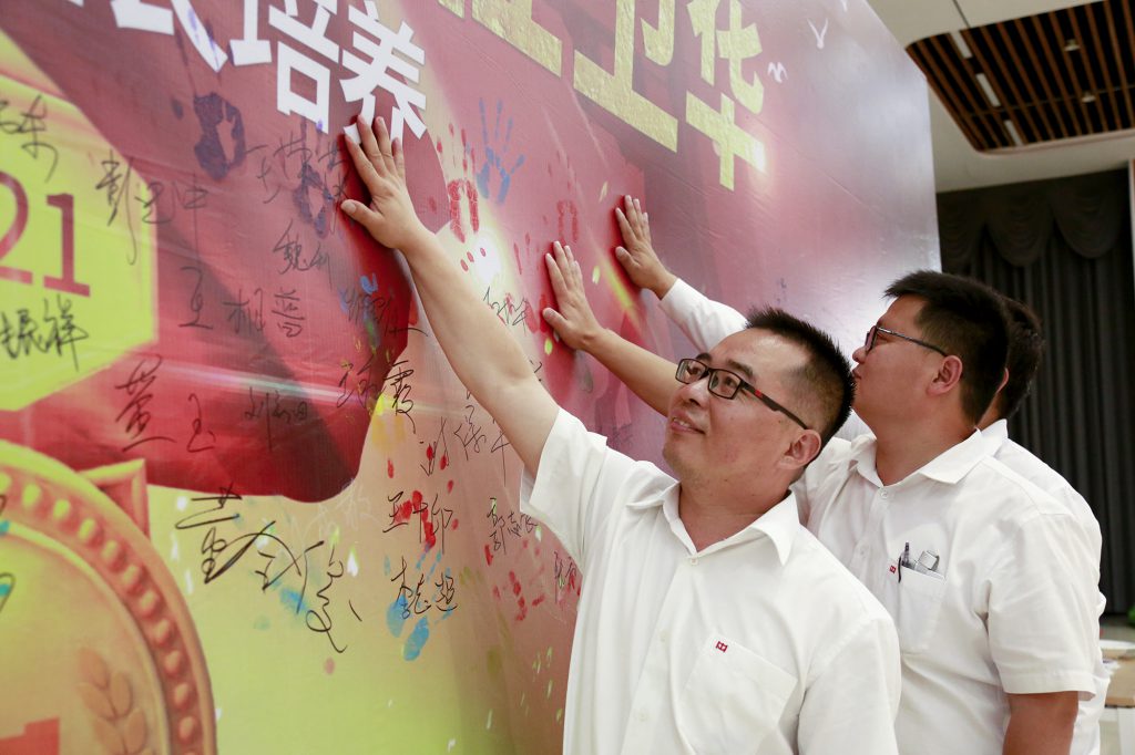 各位班组长学员在当初许下“学习先进管理知识,打造金年会|jinnianhui金牌班组”铮铮誓言的签名墙上留下掌印,五彩斑斓的掌印天空,记录了他们一路成长的印记。